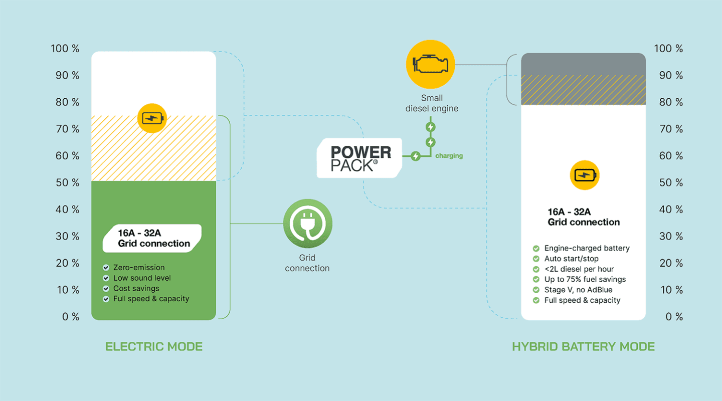 Het emissievrije eLift-systeem heeft een elektrische modus en een hybride modus. Beide hebben een efficiënte eerstelijns energiebron; de machinist kan kiezen tussen werken op stroom of op diesel. De PowerPack® batterijtechnologie vangt de pieken in het energieverbruik op en wordt opgeladen als de energiebehoefte van de kraan laag is. Met de elektrische modus bedien je de kraan 100% emissievrij op een laag geluidsniveau, zonder enige beperking in gebruik en capaciteit.
